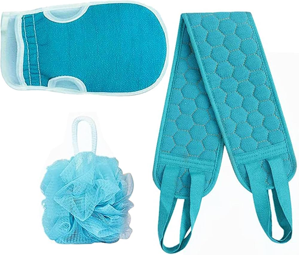 Ce set de bain exfoliant bleu comprend trois accessoires essentiels pour une peau douce et éclatante. Il contient un gant exfoliant qui s’enfile facilement pour un gommage efficace du corps, un bandeau exfoliant avec des poignées aux extrémités pour atteindre les zones difficiles comme le dos, ainsi qu’une fleur de douche en filet, parfaite pour faire mousser le savon tout en nettoyant la peau en douceur. Idéal pour une routine de soin complète sous la douche, ce kit aide à éliminer les cellules mortes et à améliorer la texture de la peau.